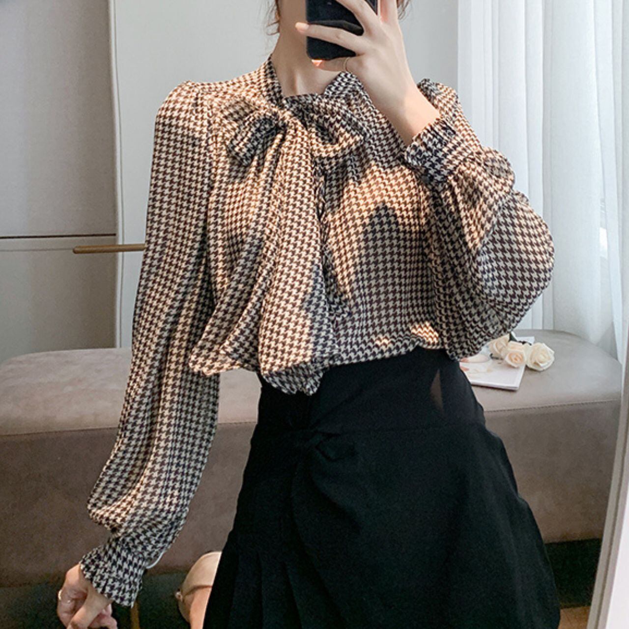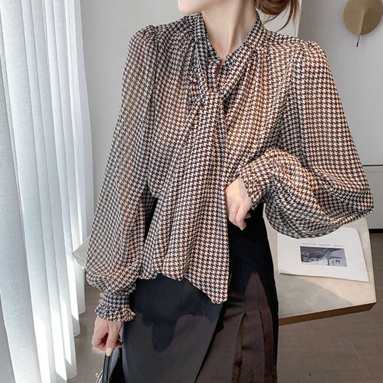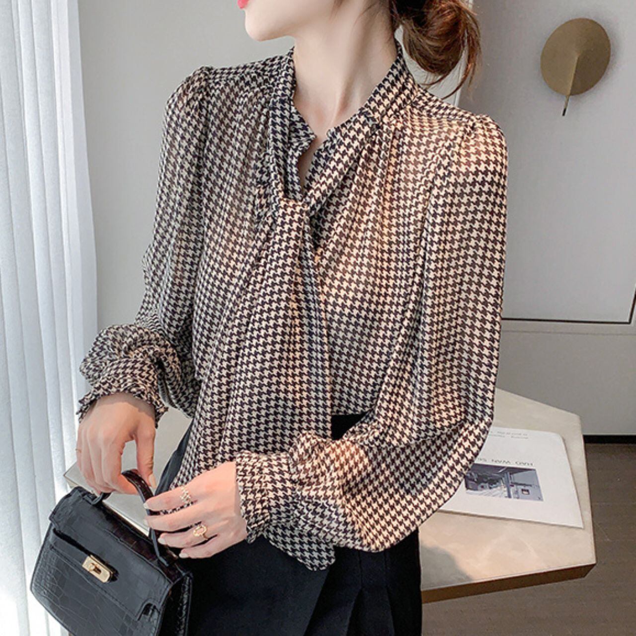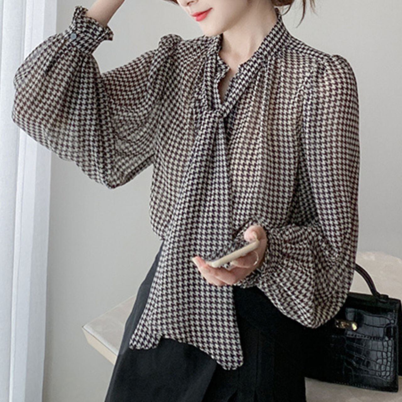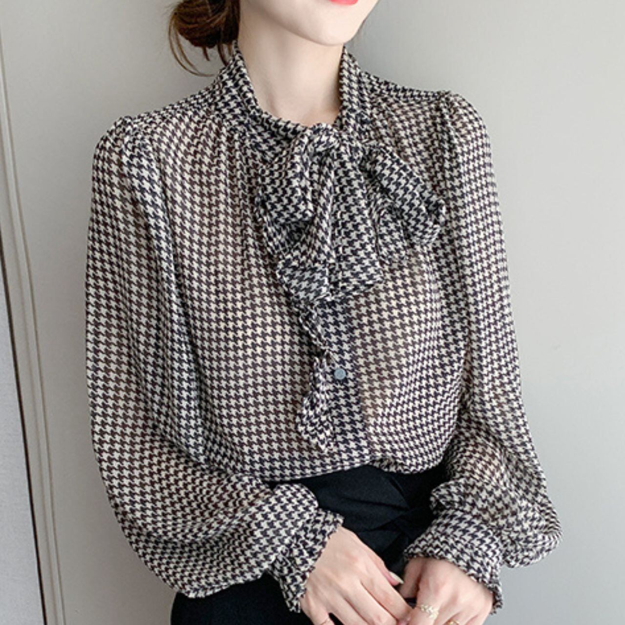 ハウンドトゥースボウタイシフォンブラウス 00120