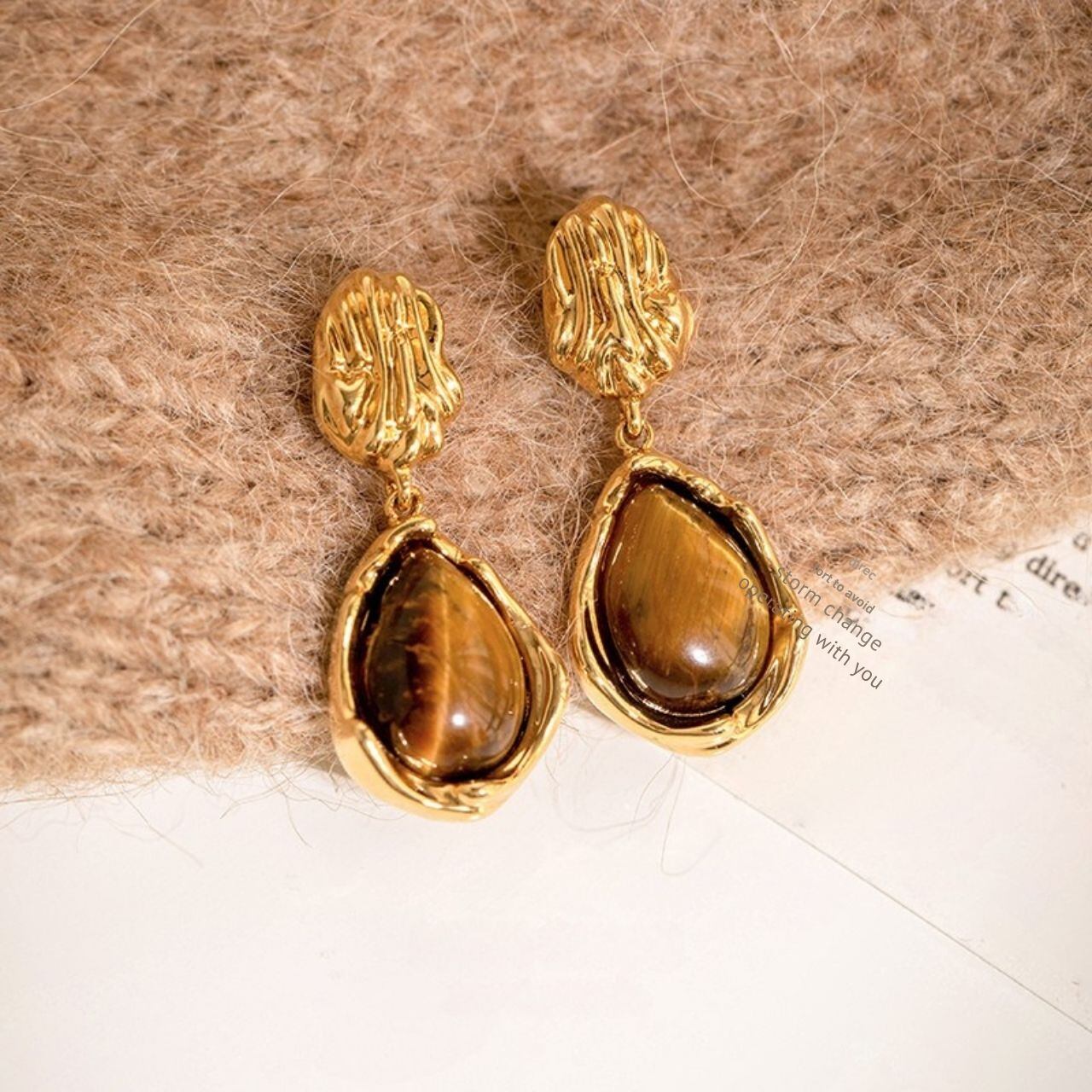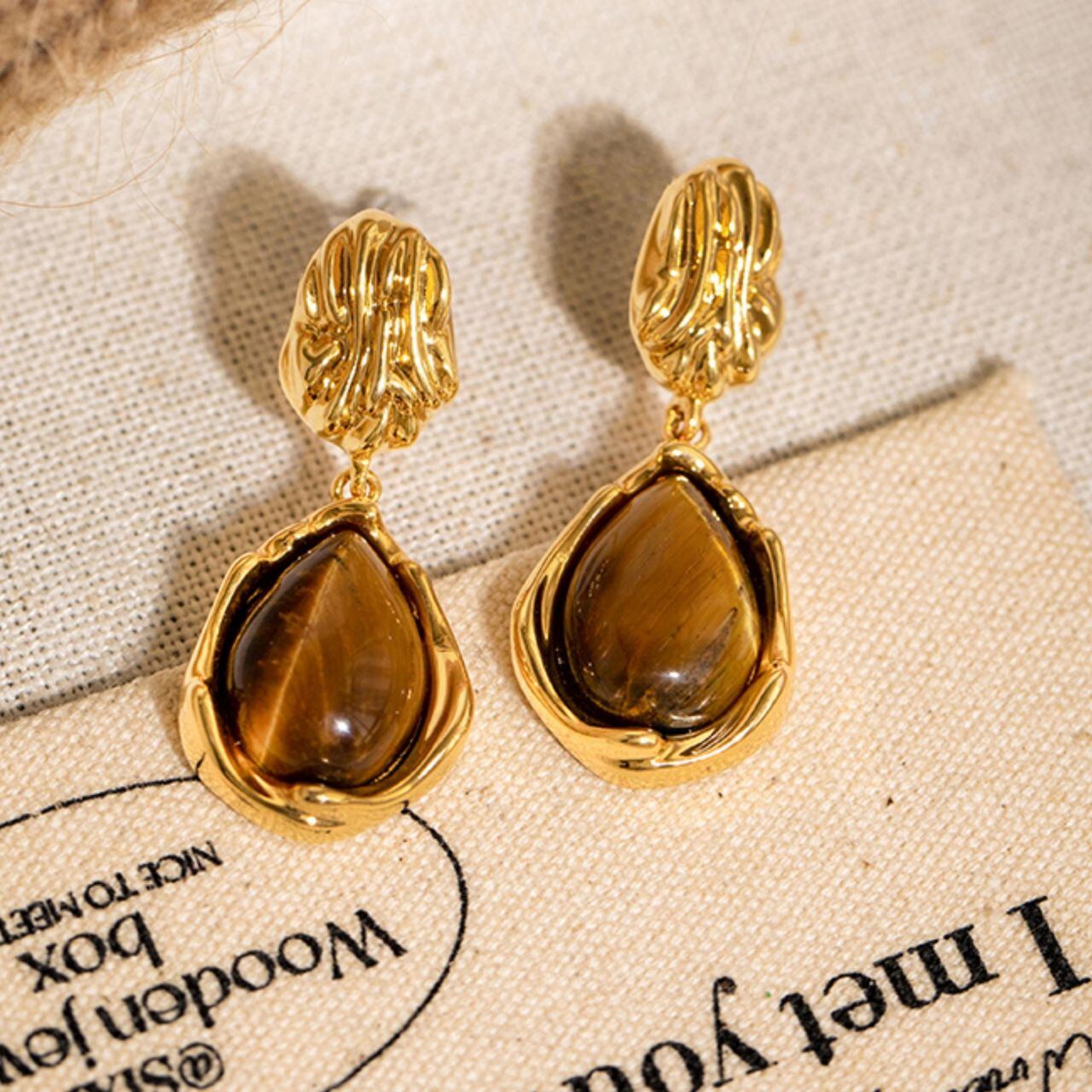ドロップ型のタイガーアイ風ストーンが輝く、メタルフレームイヤリング。