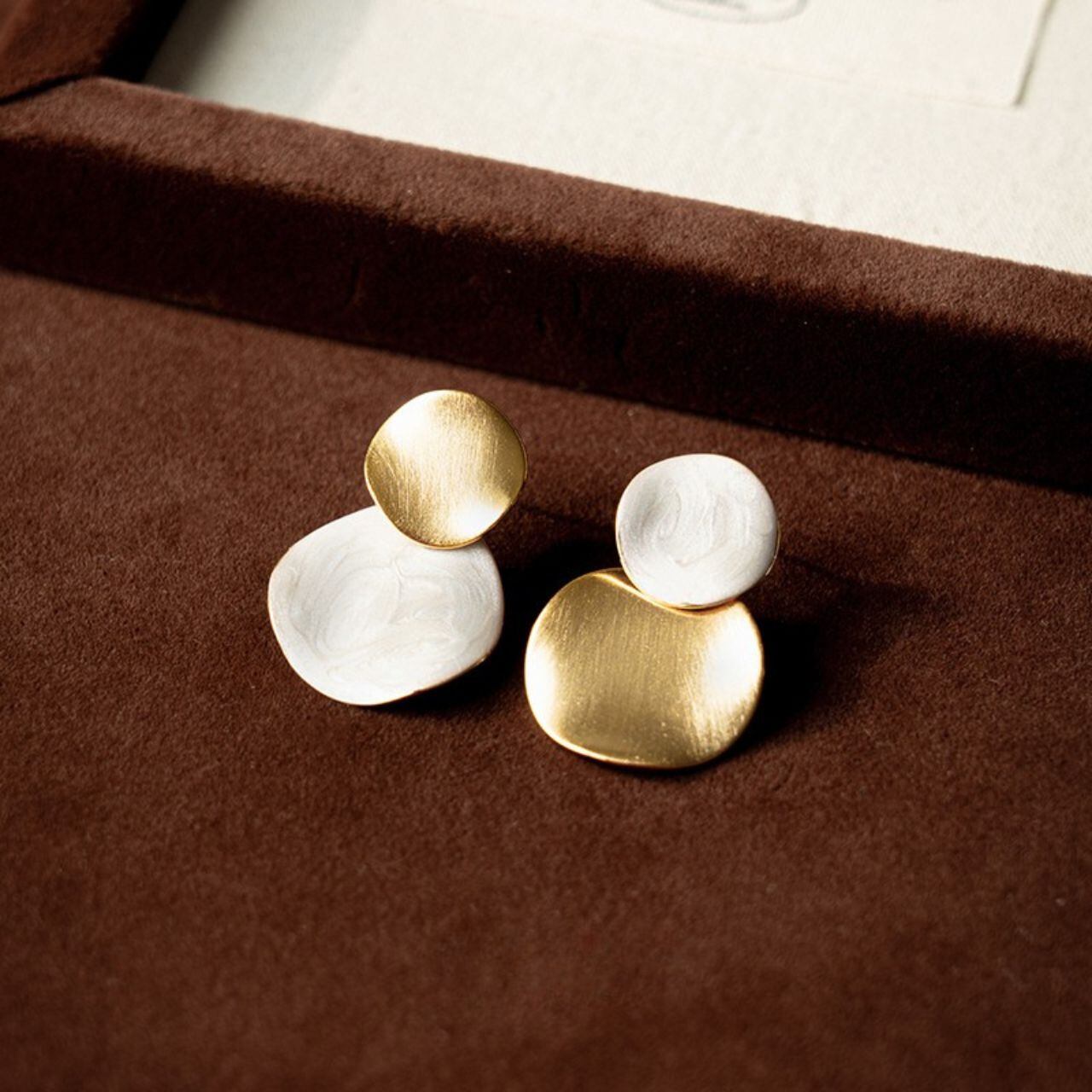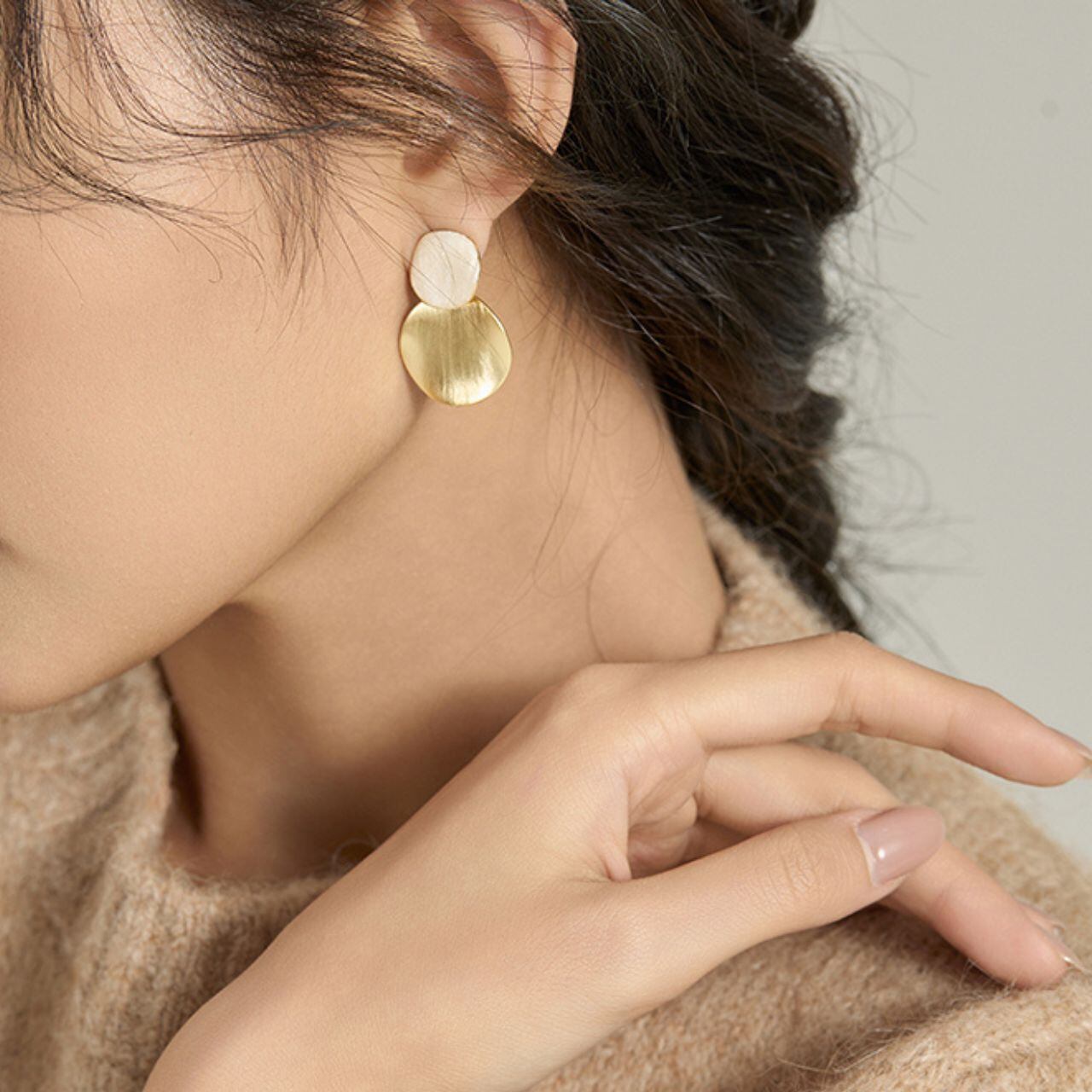 マットゴールドとやわらかなホワイトのコントラストが、耳元に上品なアクセントを添えるイヤリング。