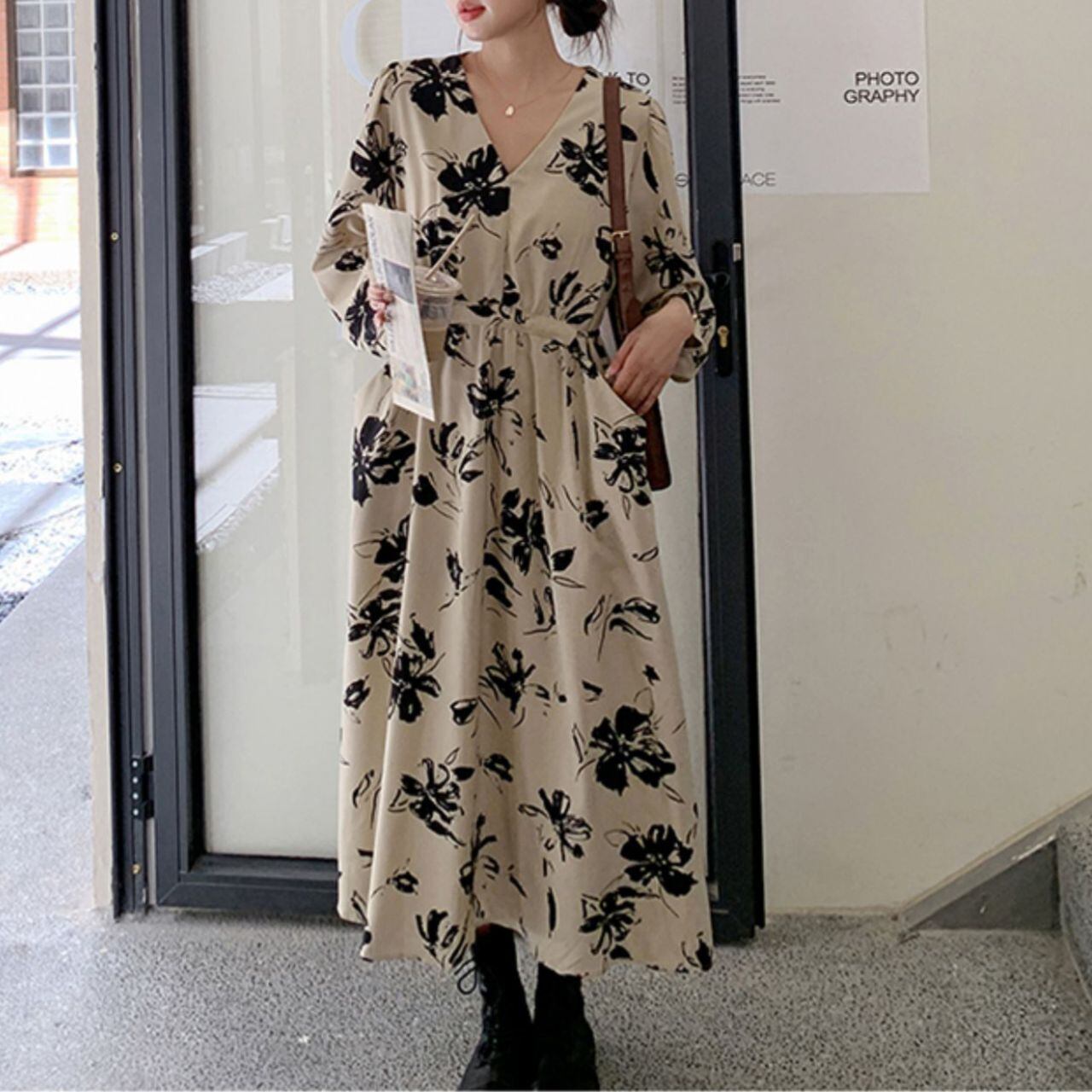 モノクロフラワープリントVネックワンピース 00146