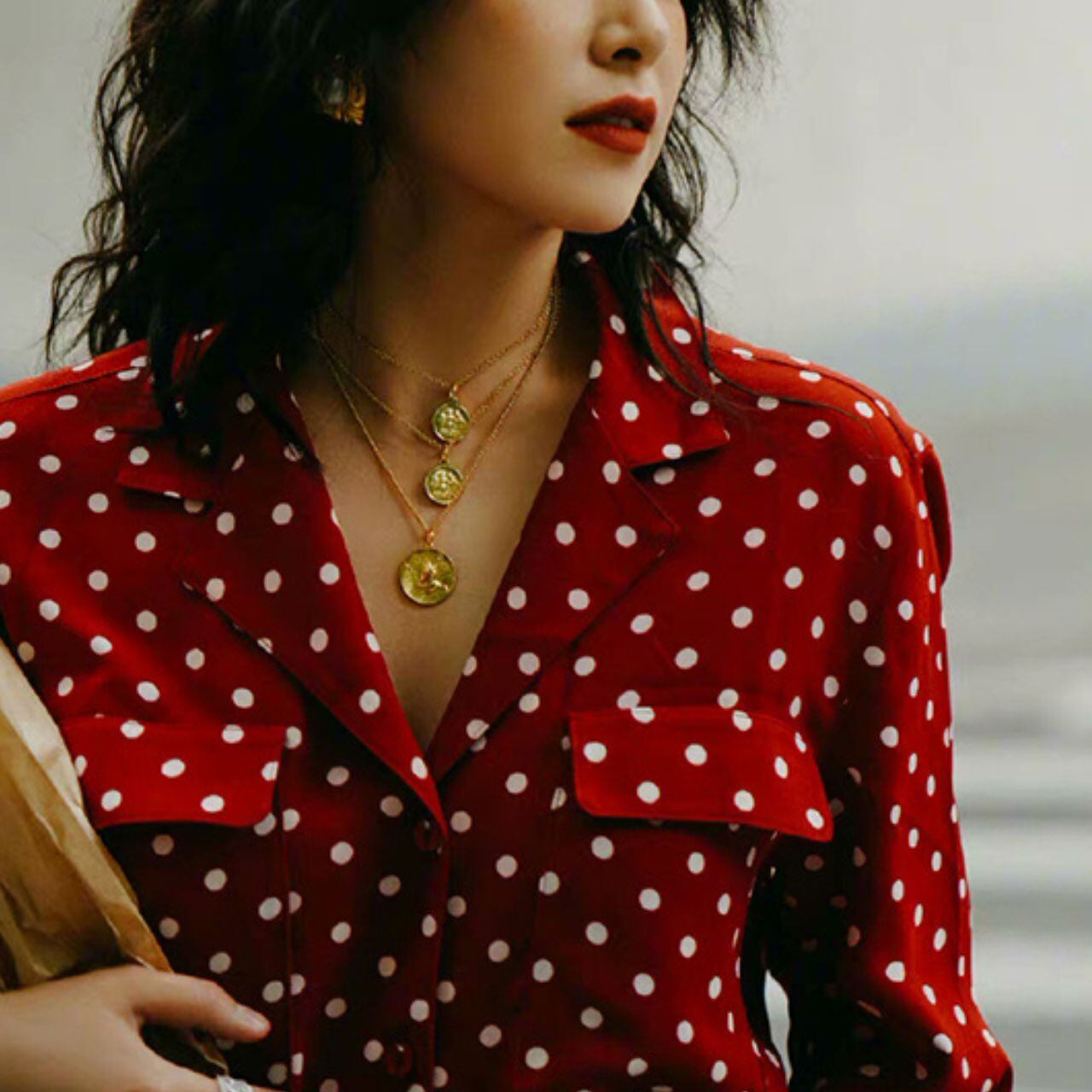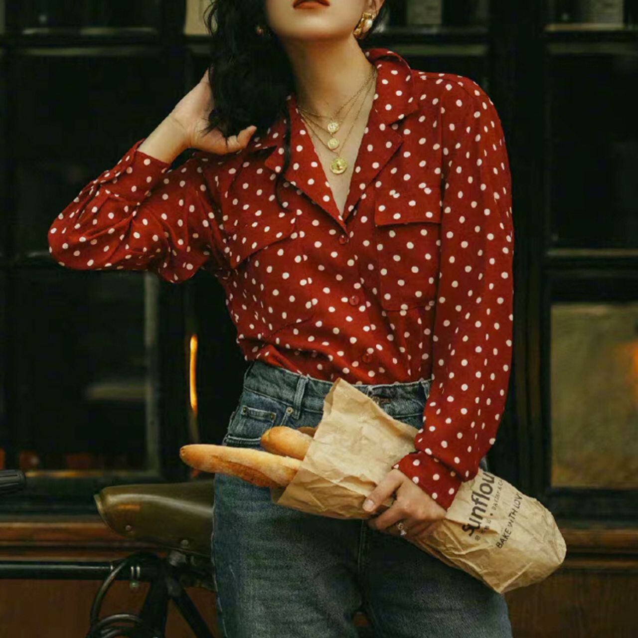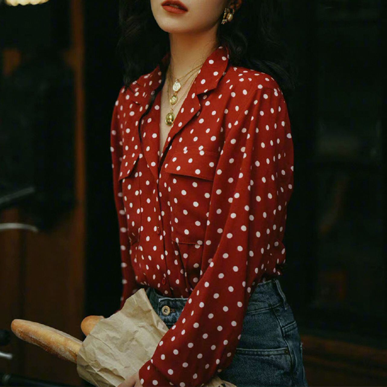 深みのあるレッドにホワイトのドットをあしらった、オープンカラーブラウス。