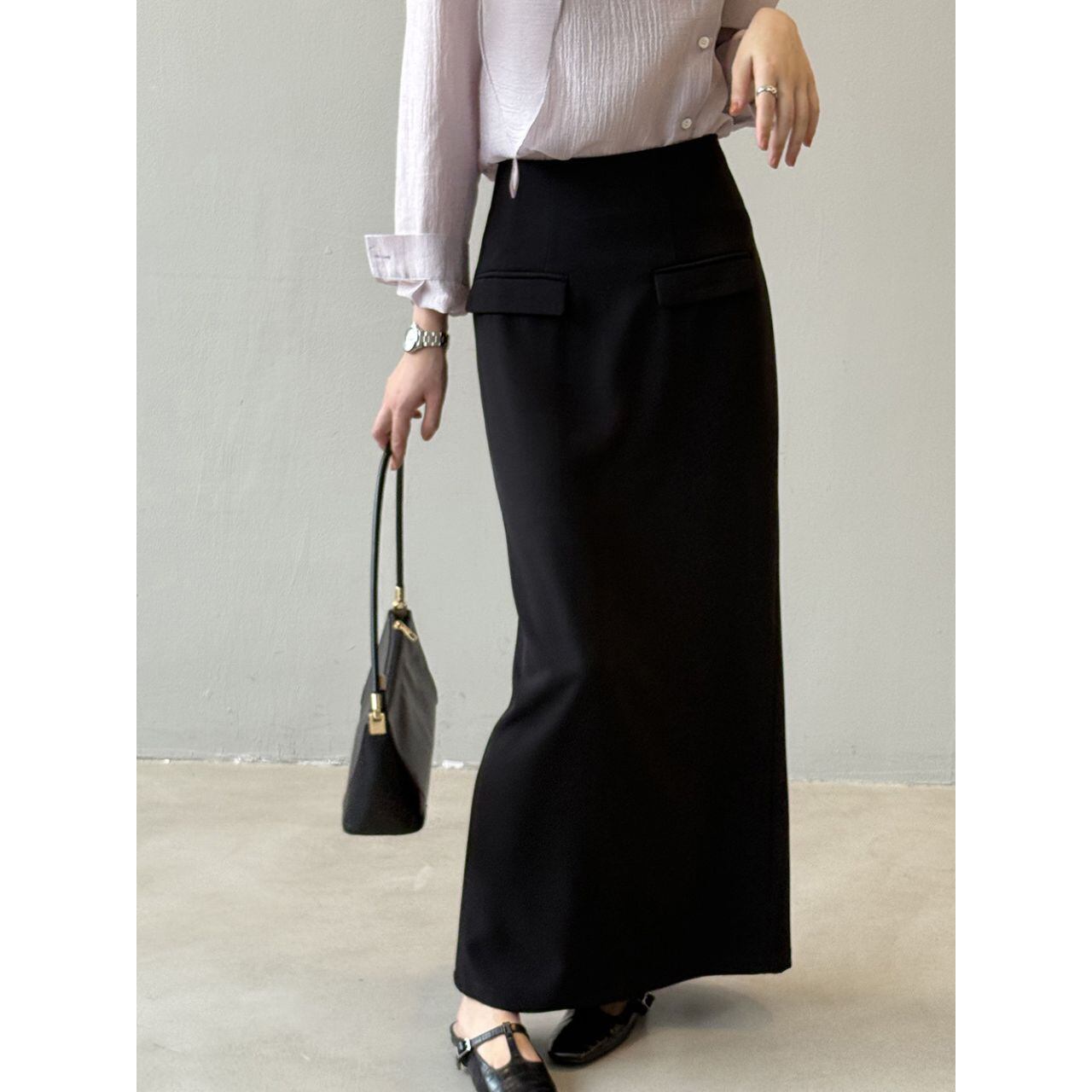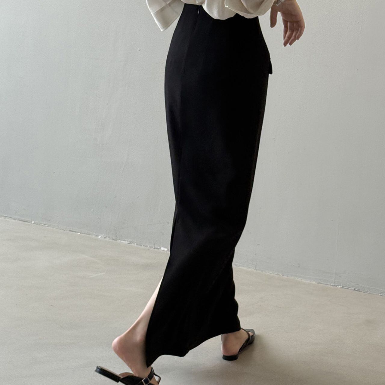 歩くたびに流れる直線のラインとバックスリットが、大人の装いに凛とした雰囲気を添えます。