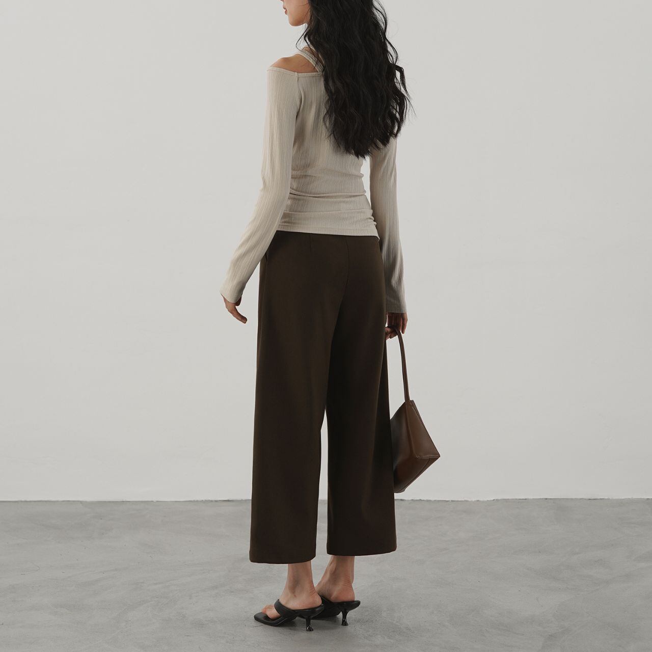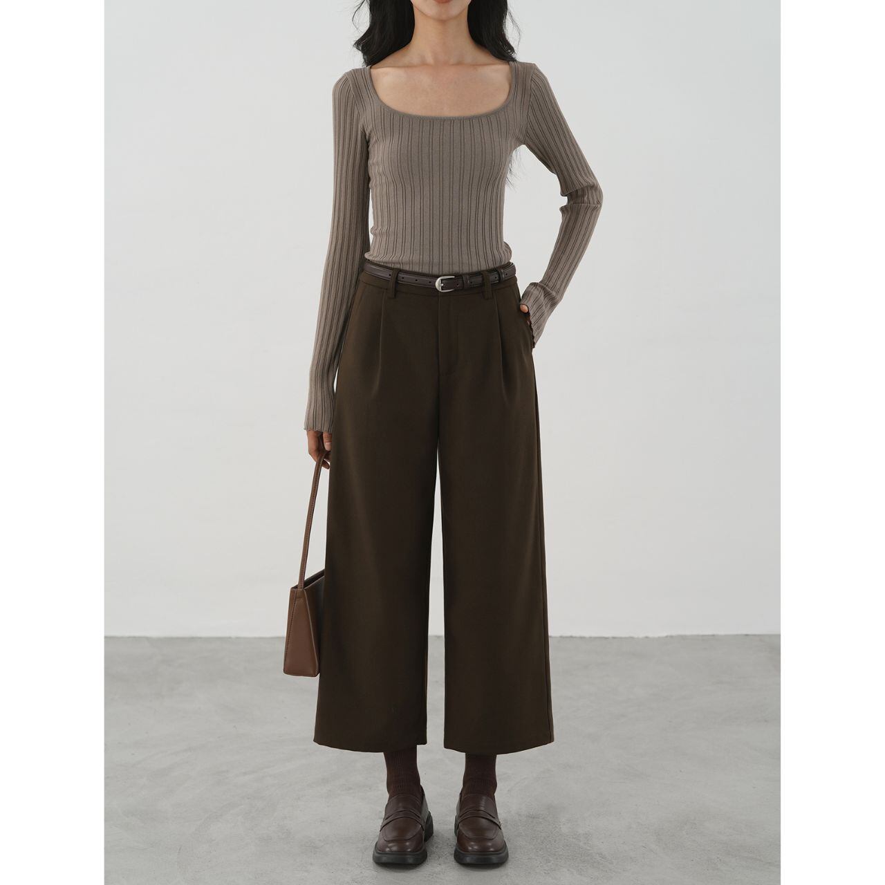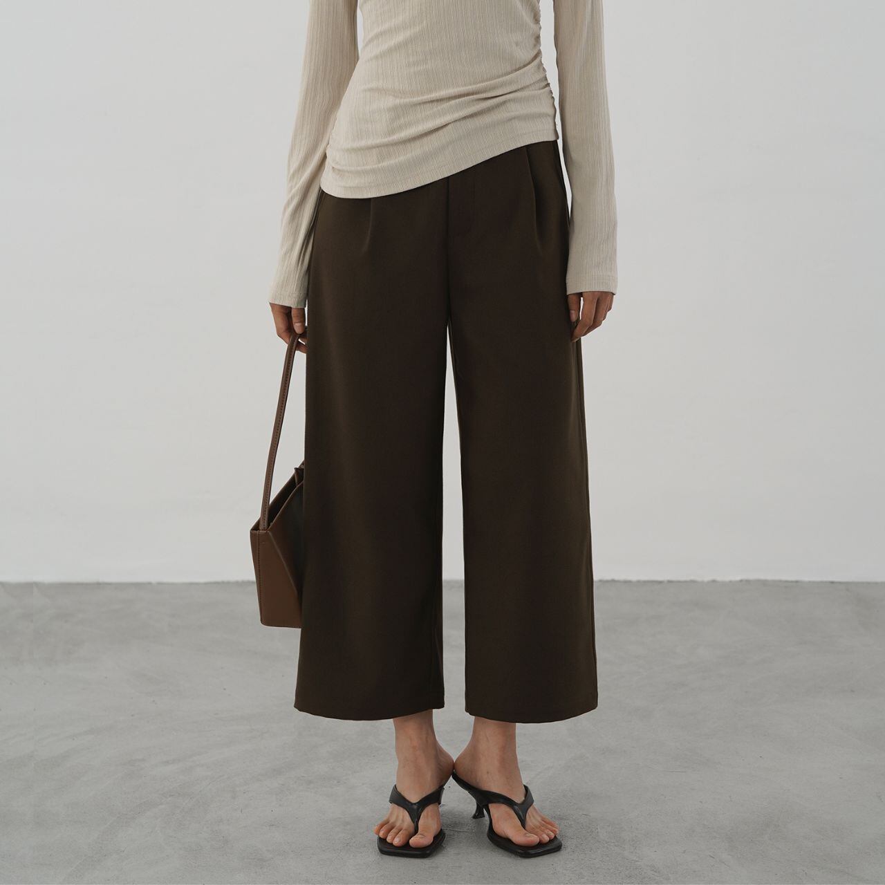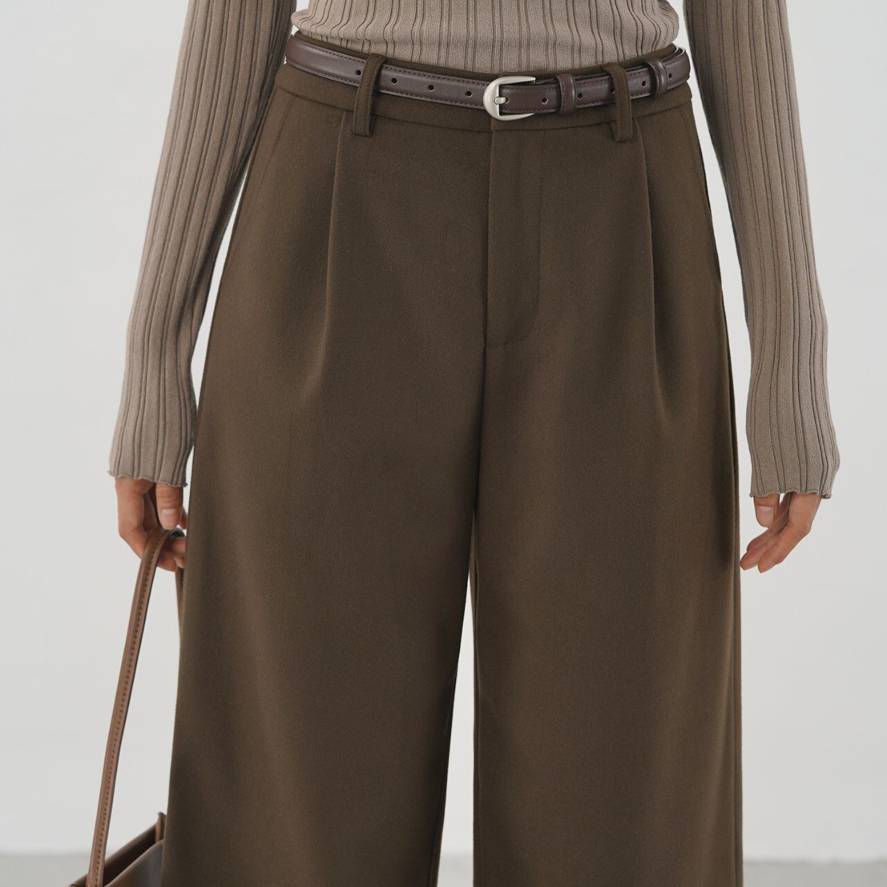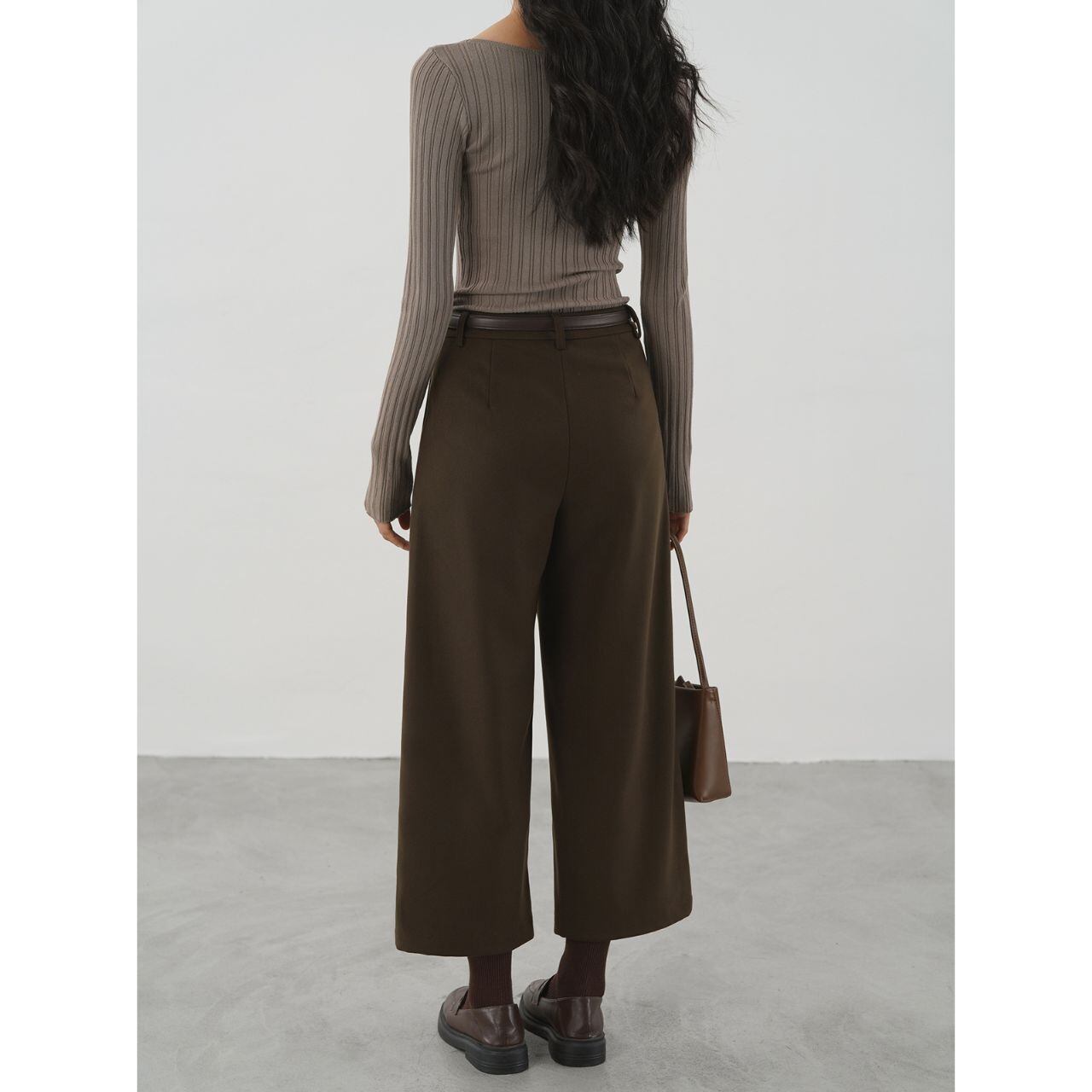 深みのあるチョコレートブラウンが、装いに落ち着きとクラシカルなニュアンスを添えるワイドパンツ。