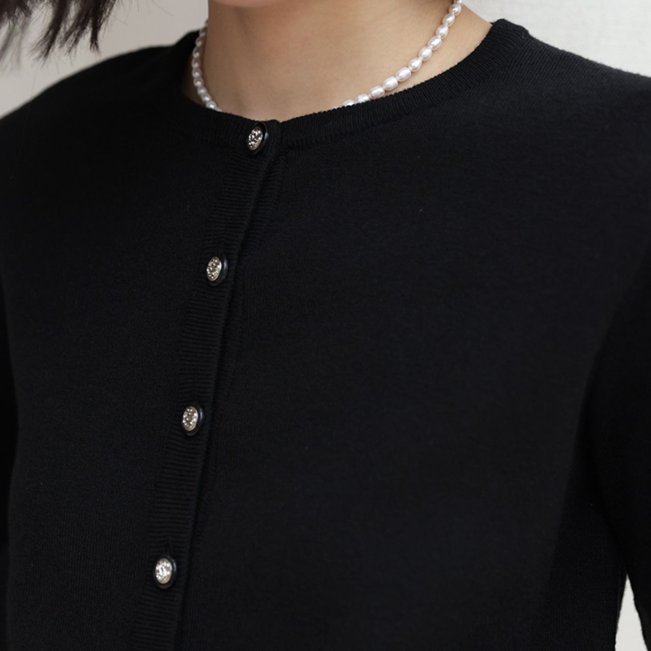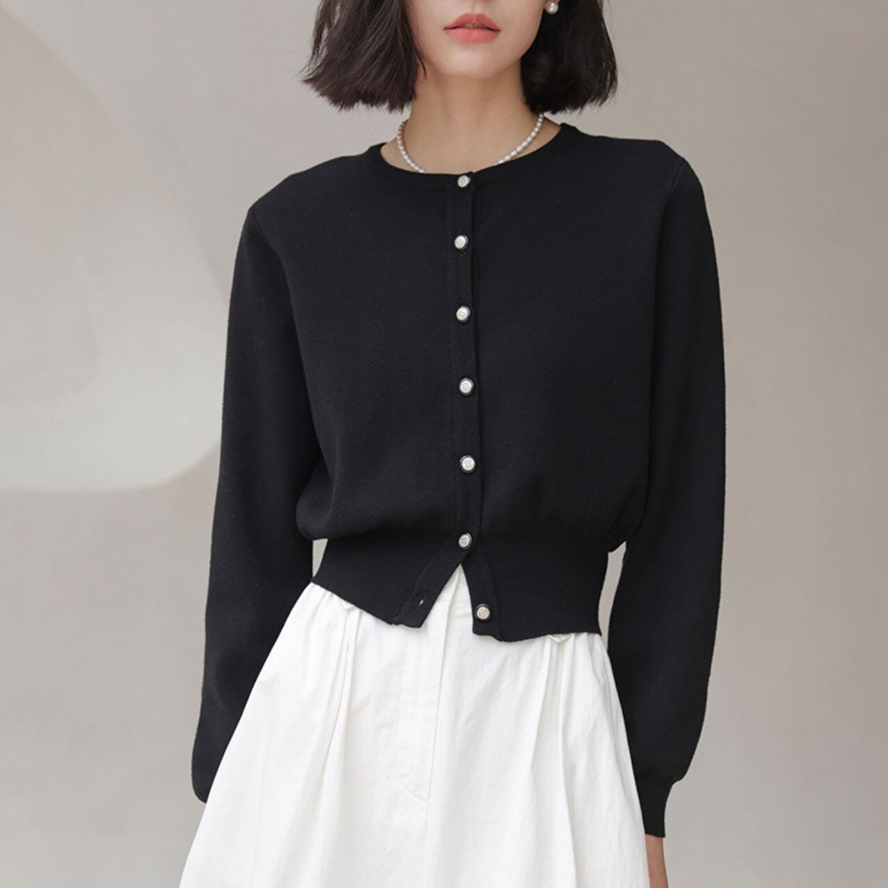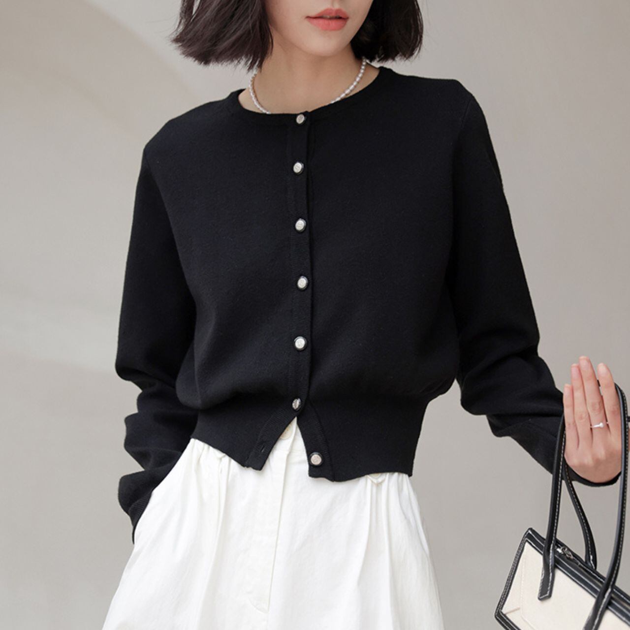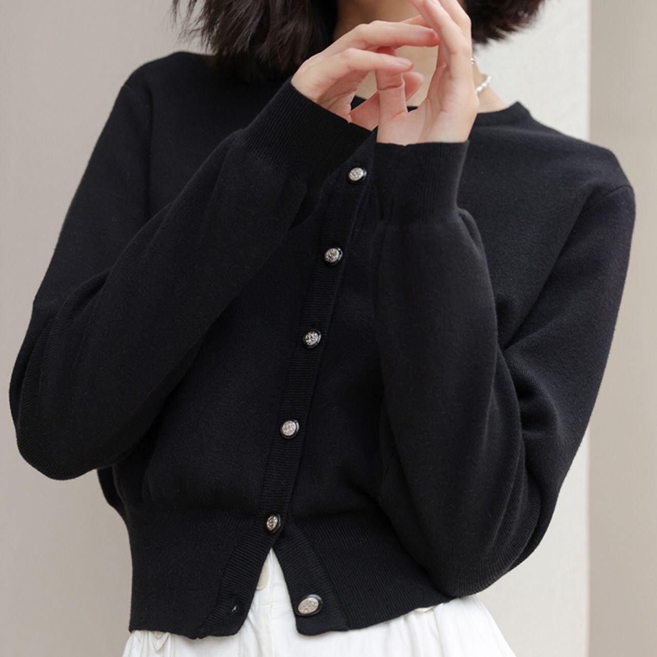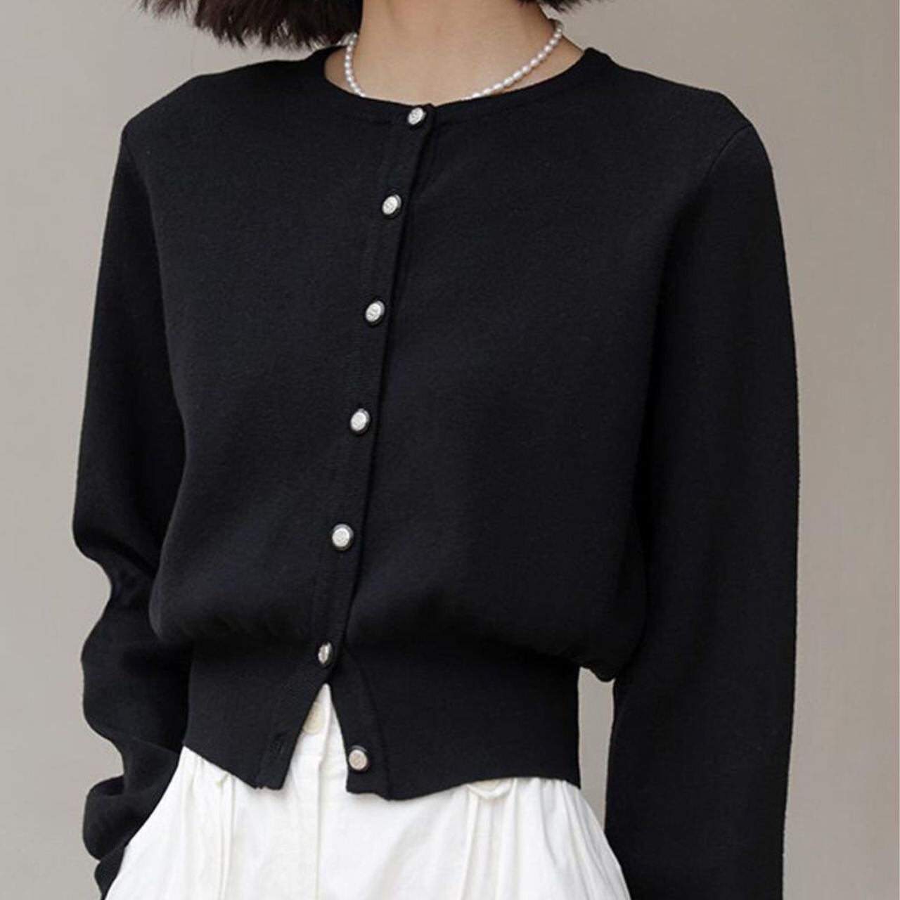 メタルボタンが印象的な、ブラックカーディガン。