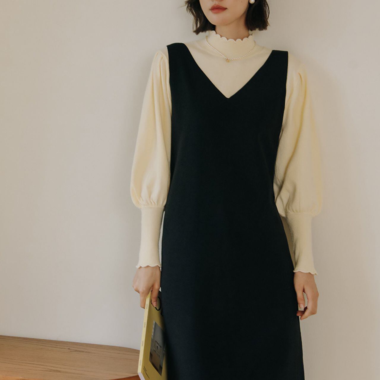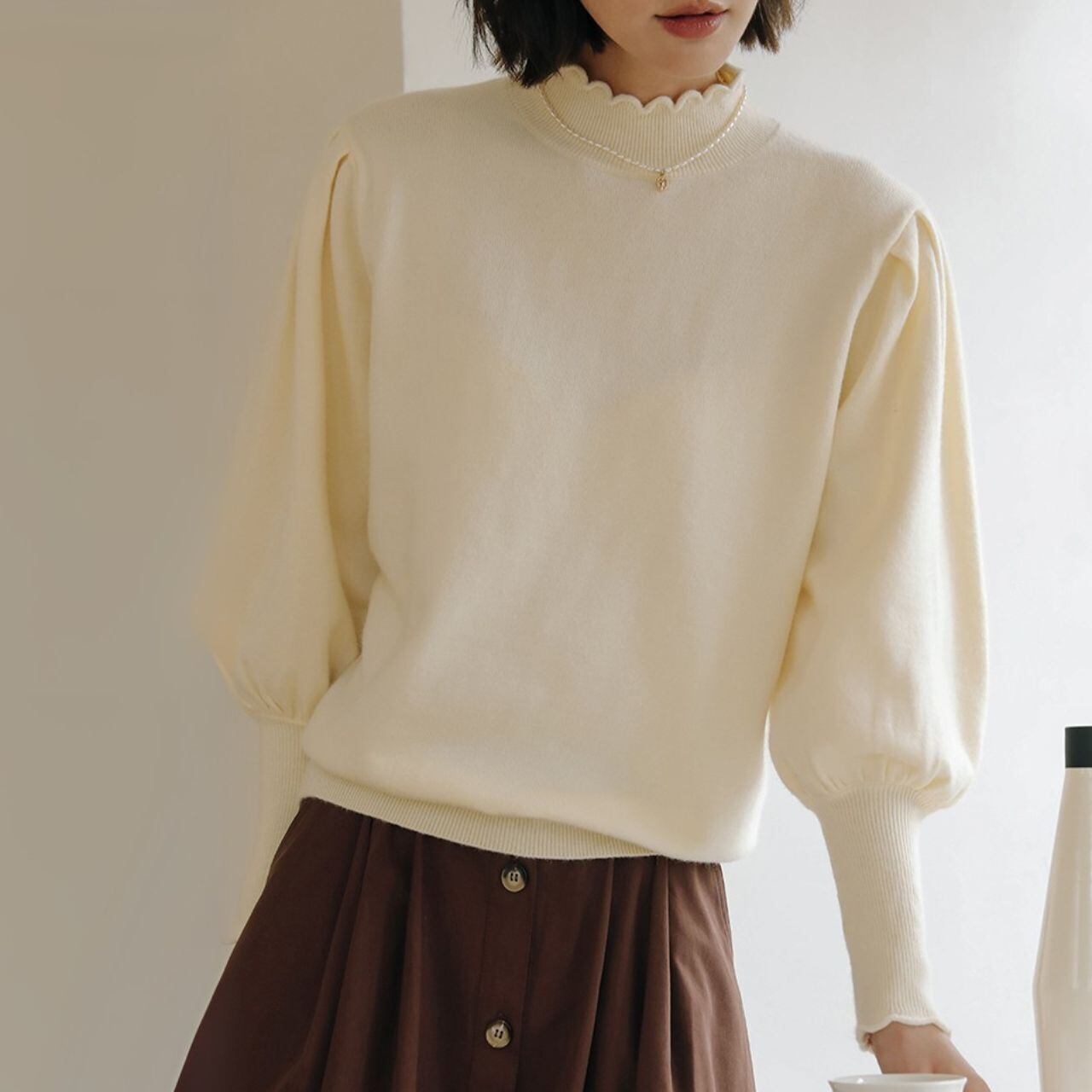 ふんわりとしたパフスリーブで優しい雰囲気を演出し、シンプルながら女性らしさを引き立てます。