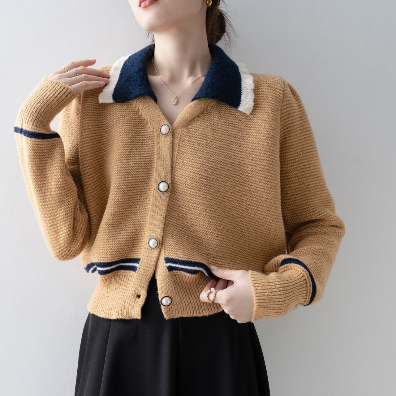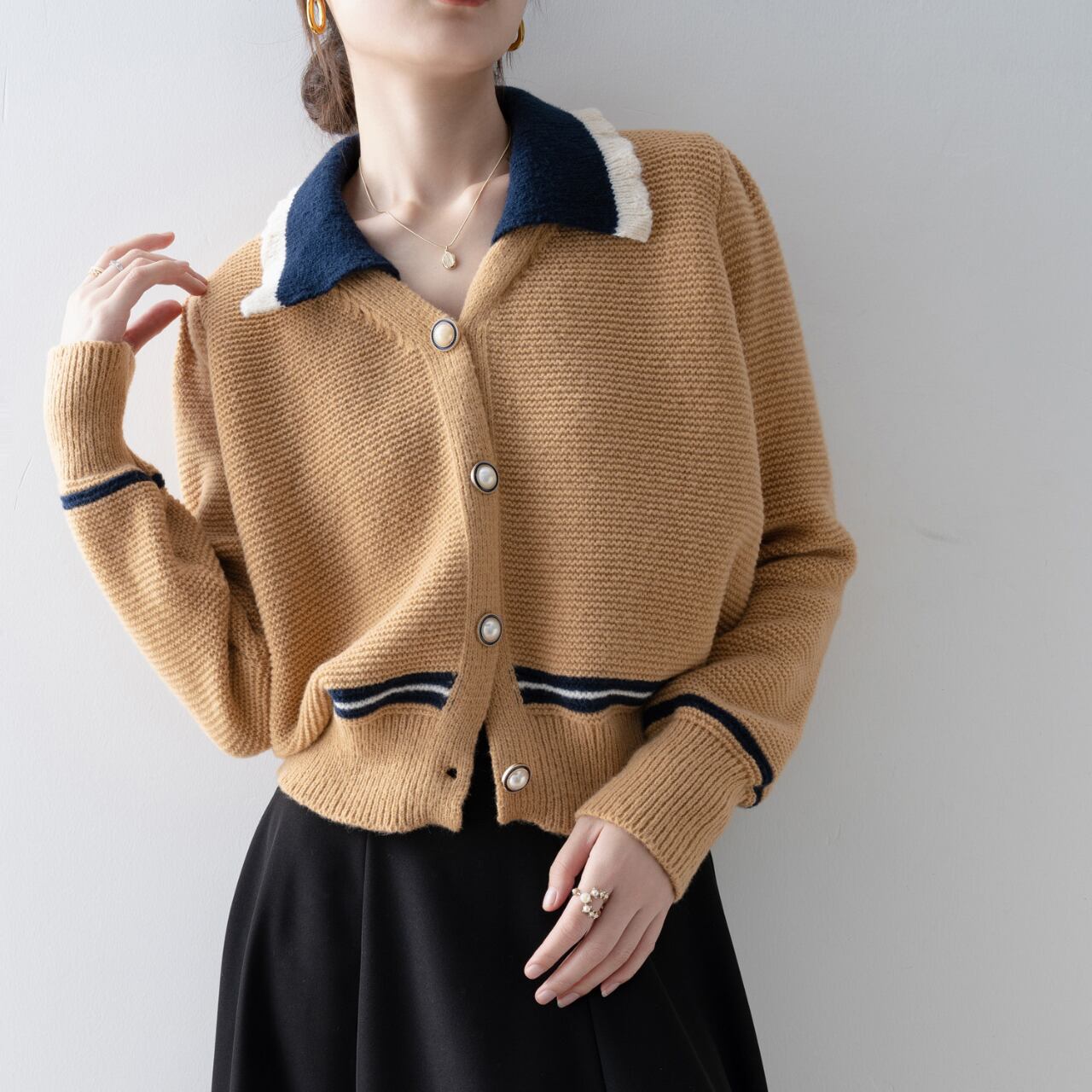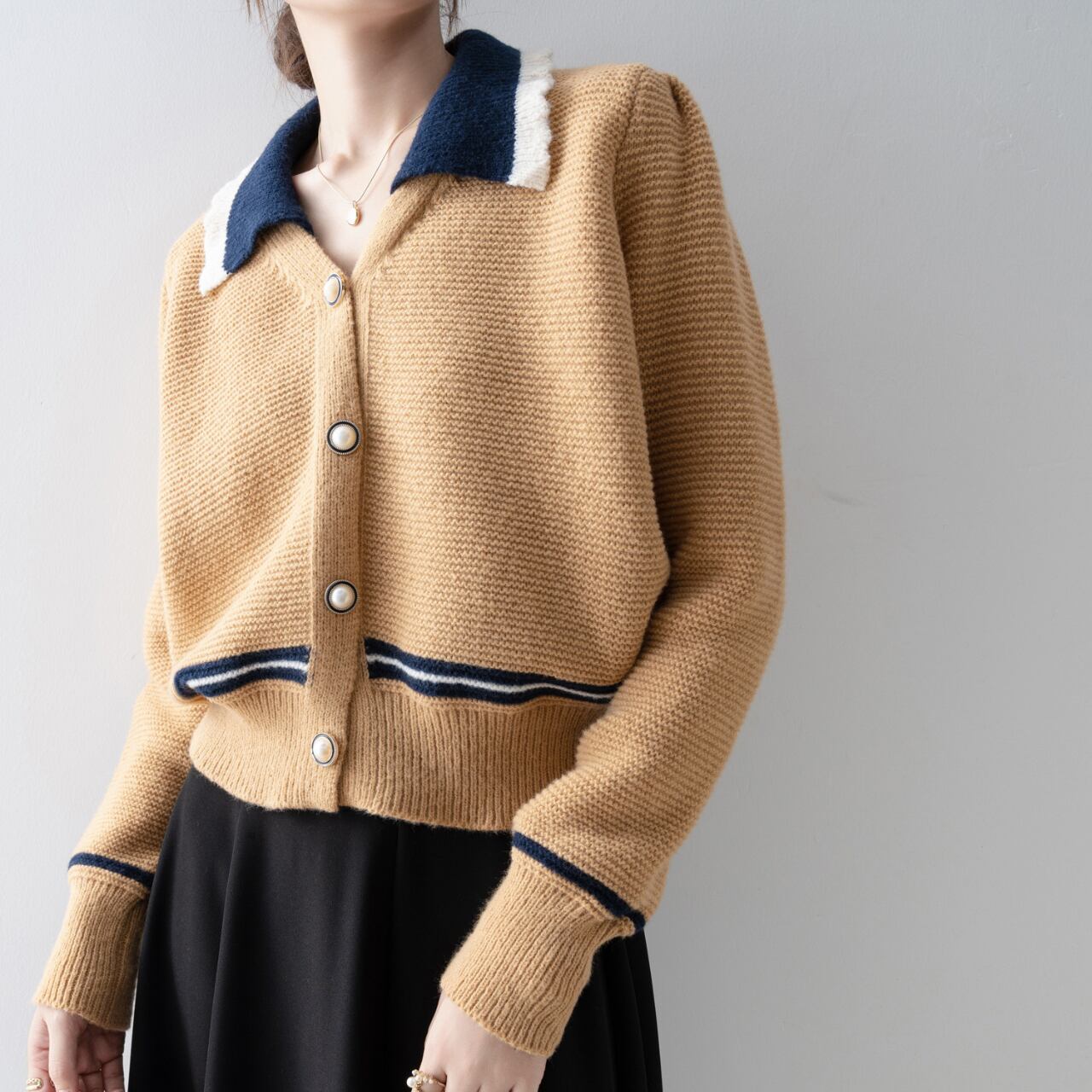 バイカラーが印象的な襟付きカーディガン。