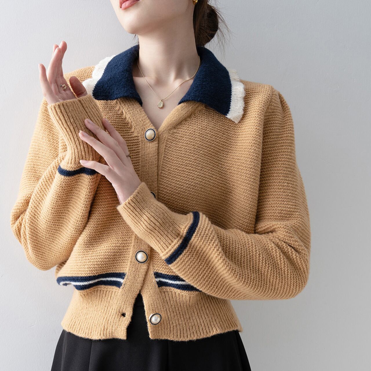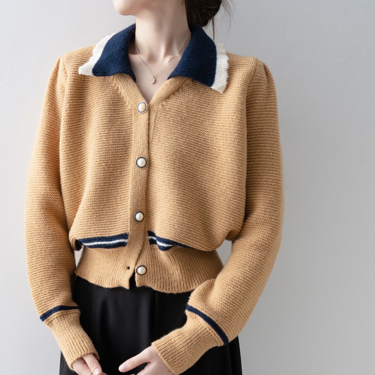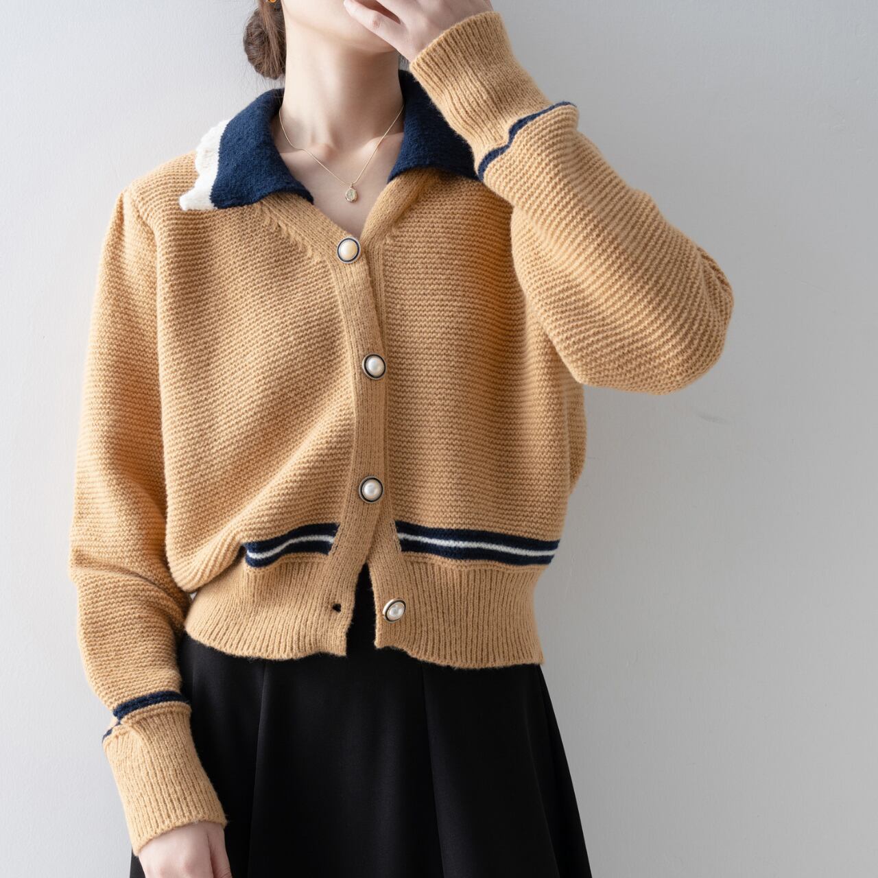 バイカラーが印象的な襟付きカーディガン。