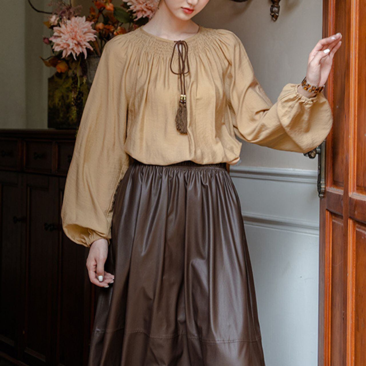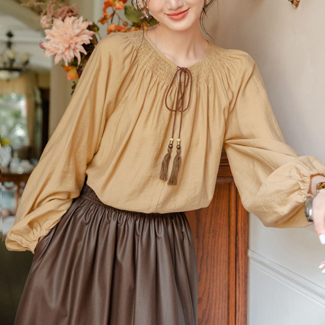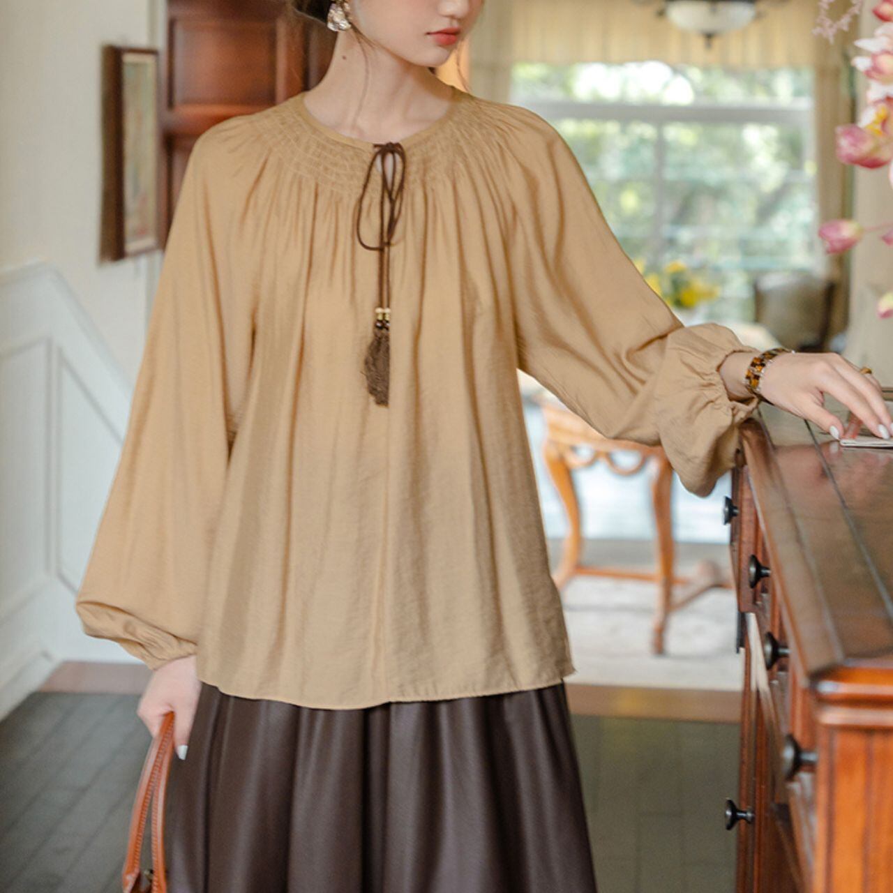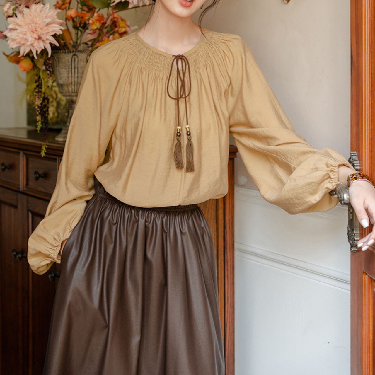 首元のふんわりとしたギャザーとタッセルリボンが印象的な一枚。