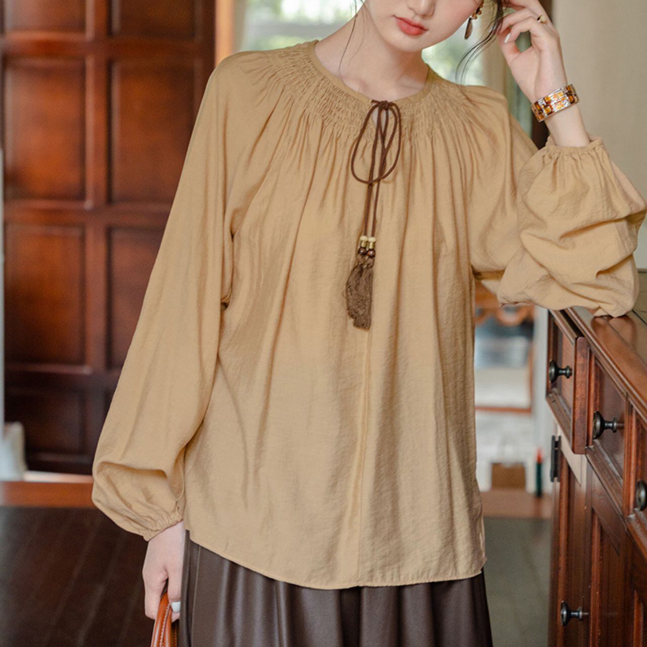 タッセルリボンギャザーブラウス 00184