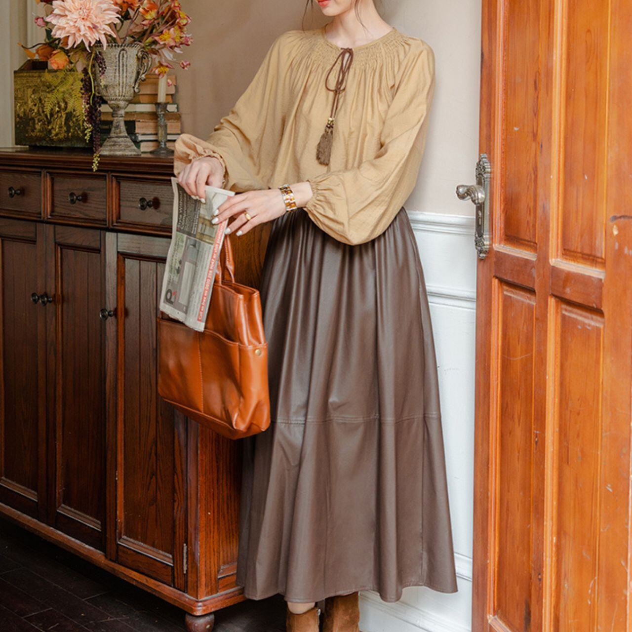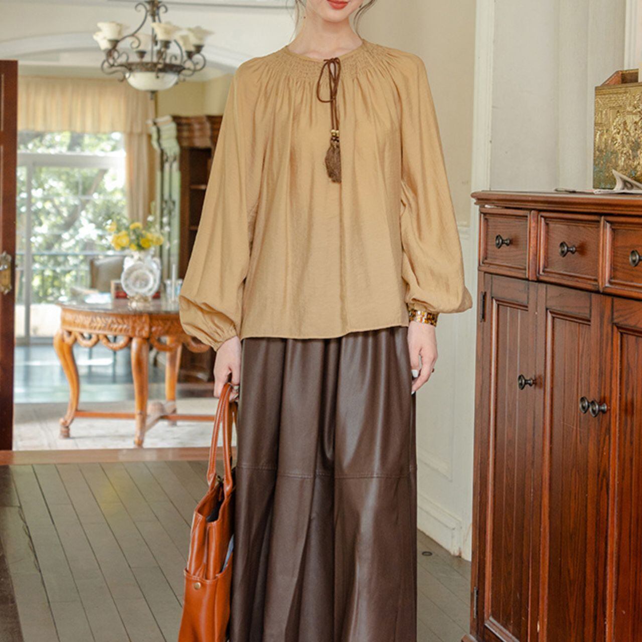 ボリュームスリーブがシルエットに余裕を持たせ、抜け感のある大人のスタイルに。