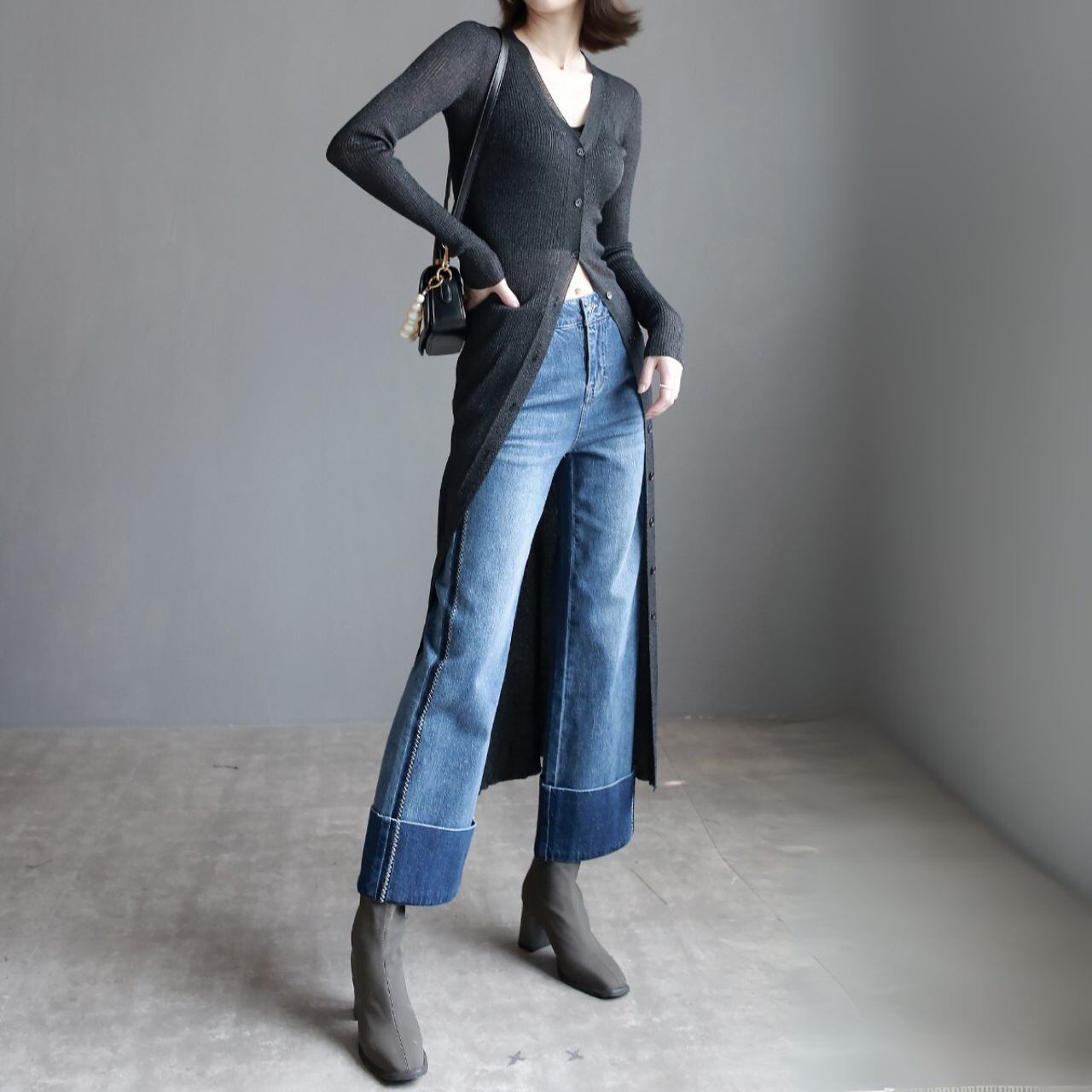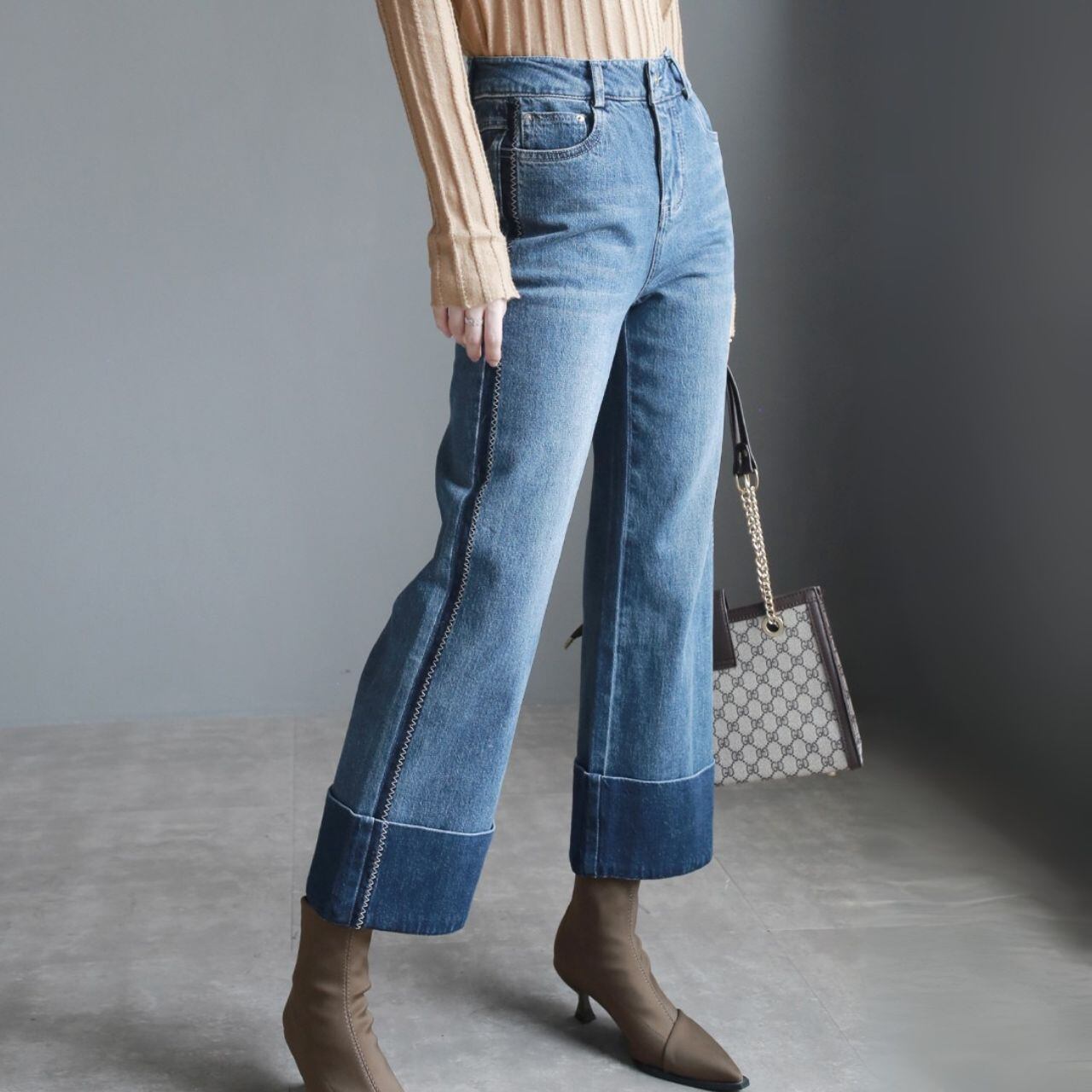 裾をロールアップした9分丈デザインで、脚長効果も期待できます。