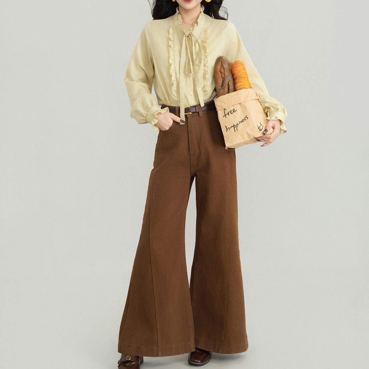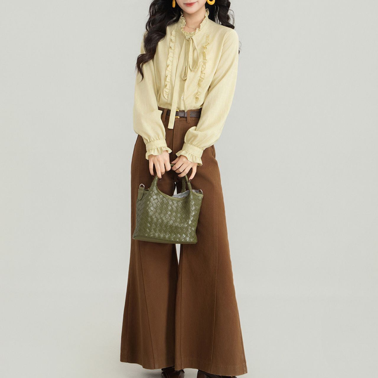 首元にあしらわれた繊細なフリルとリボンタイが、クラシカルで上品な印象を添えるブラウス。