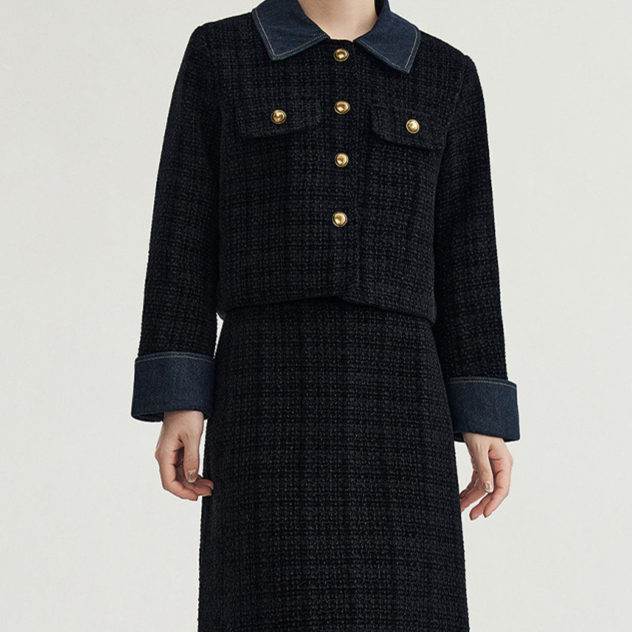 上品なツイード生地に、デニムの襟とカフスを掛け合わせたモダンなショートジャケット。