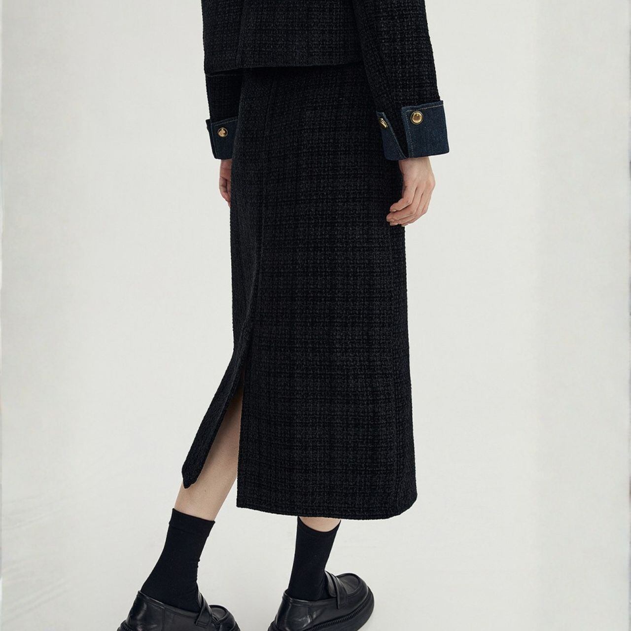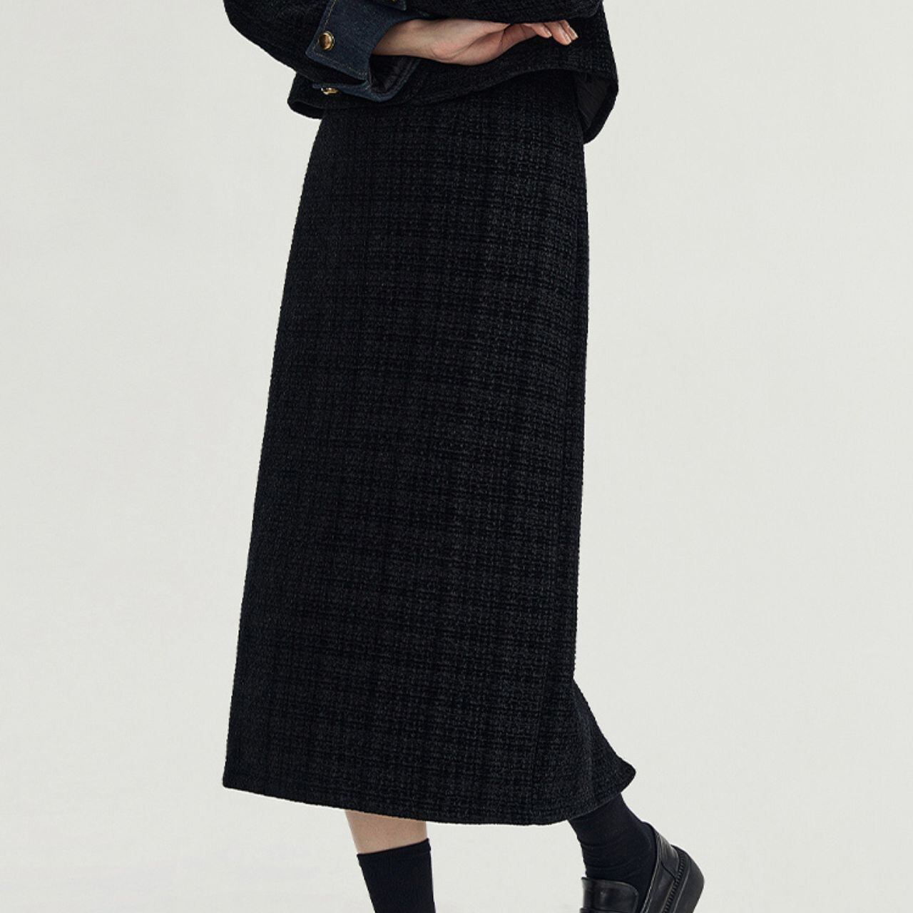 ツイードの上質な風合いが引き立つ、ストレートラインのミディ丈スカート。